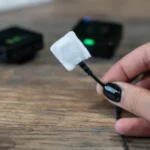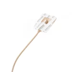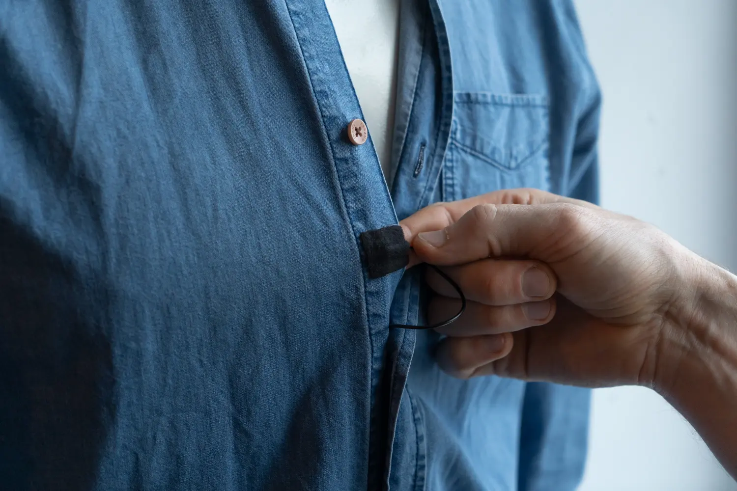 Su diseño de perfil bajo la hace prácticamente invisible en cámara cuando se usa debajo de prendas; se fija con una cinta adhesiva de doble cara (como la Invisible Lav Tape), permitiendo montajes seguros en piel o tejidos sin clips visibles.