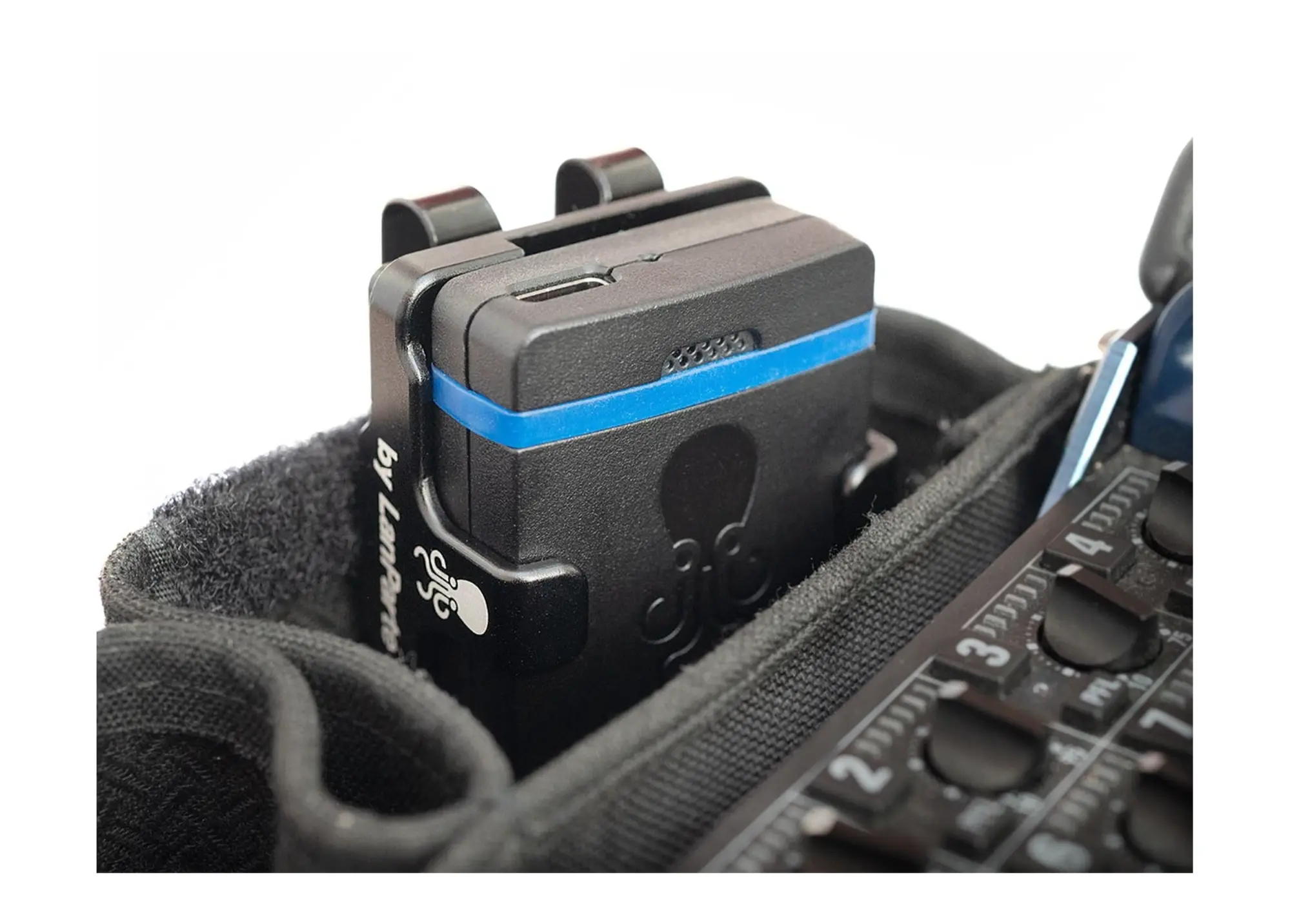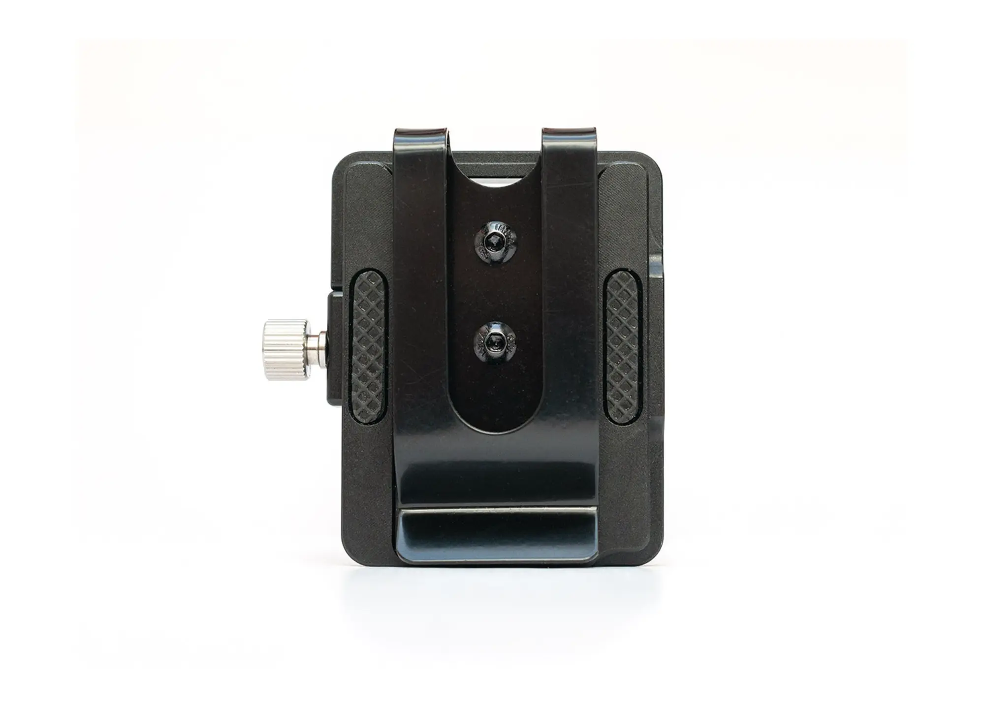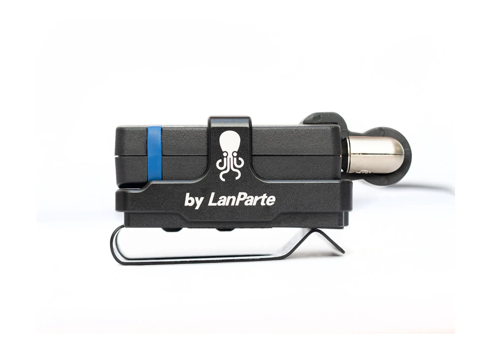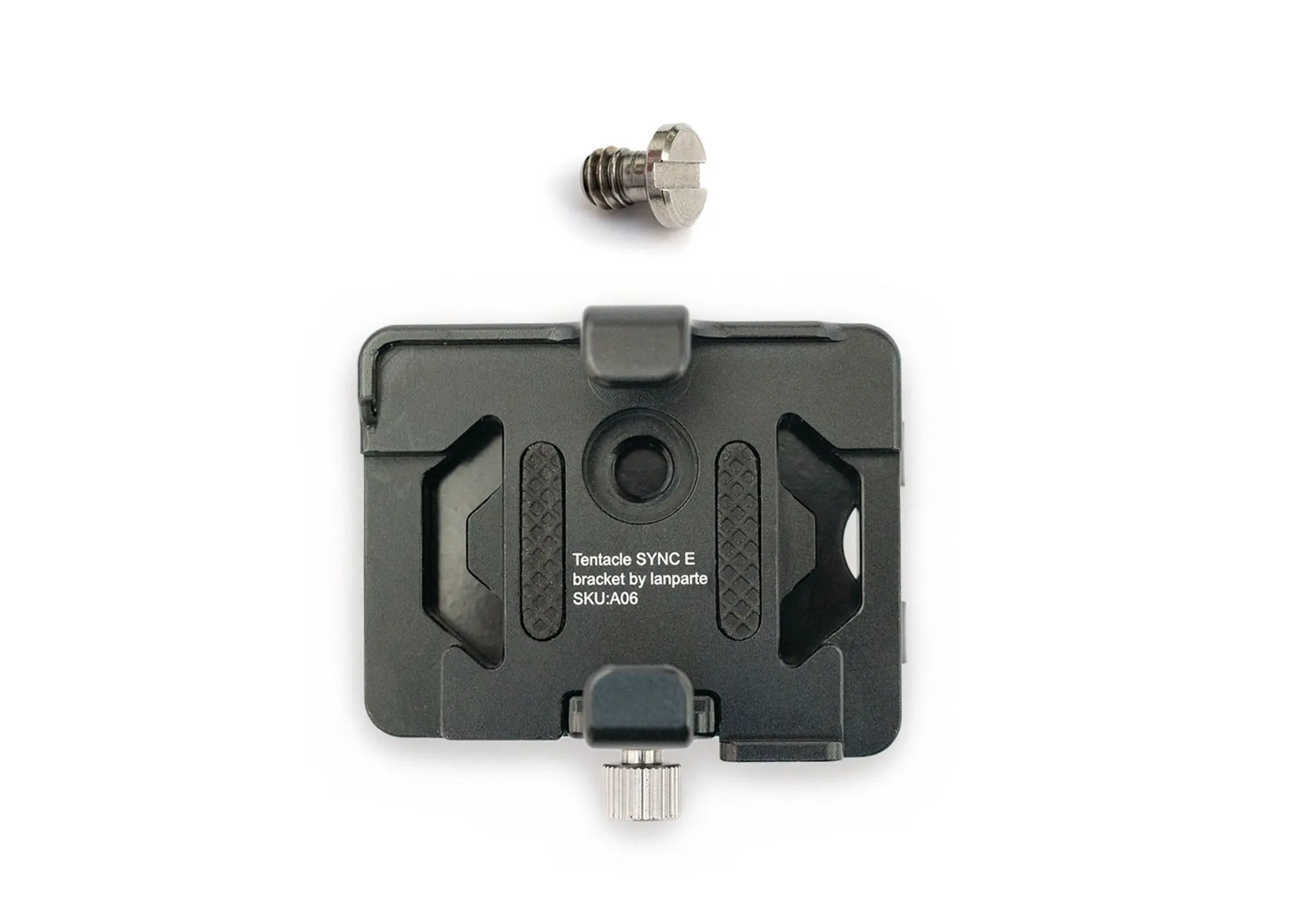 Soporte de aluminio ligero para Tentacle SYNC E con clip cinturón, fabricado por LanParte. Fijación posible en cámara, rig mediante tornillo 1/4″ o en cinturón gracias al clip incluido.
