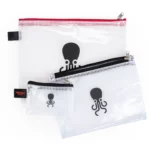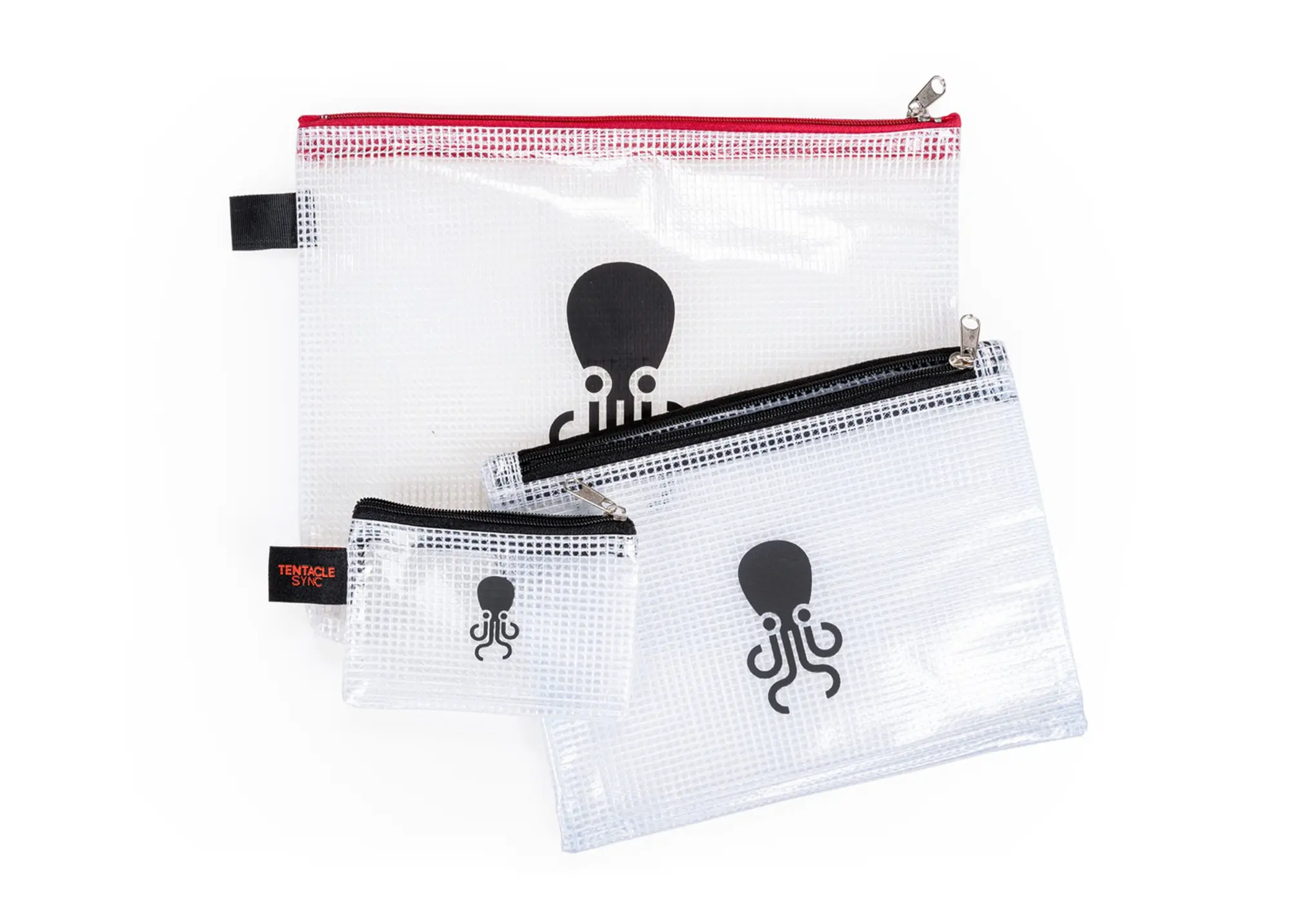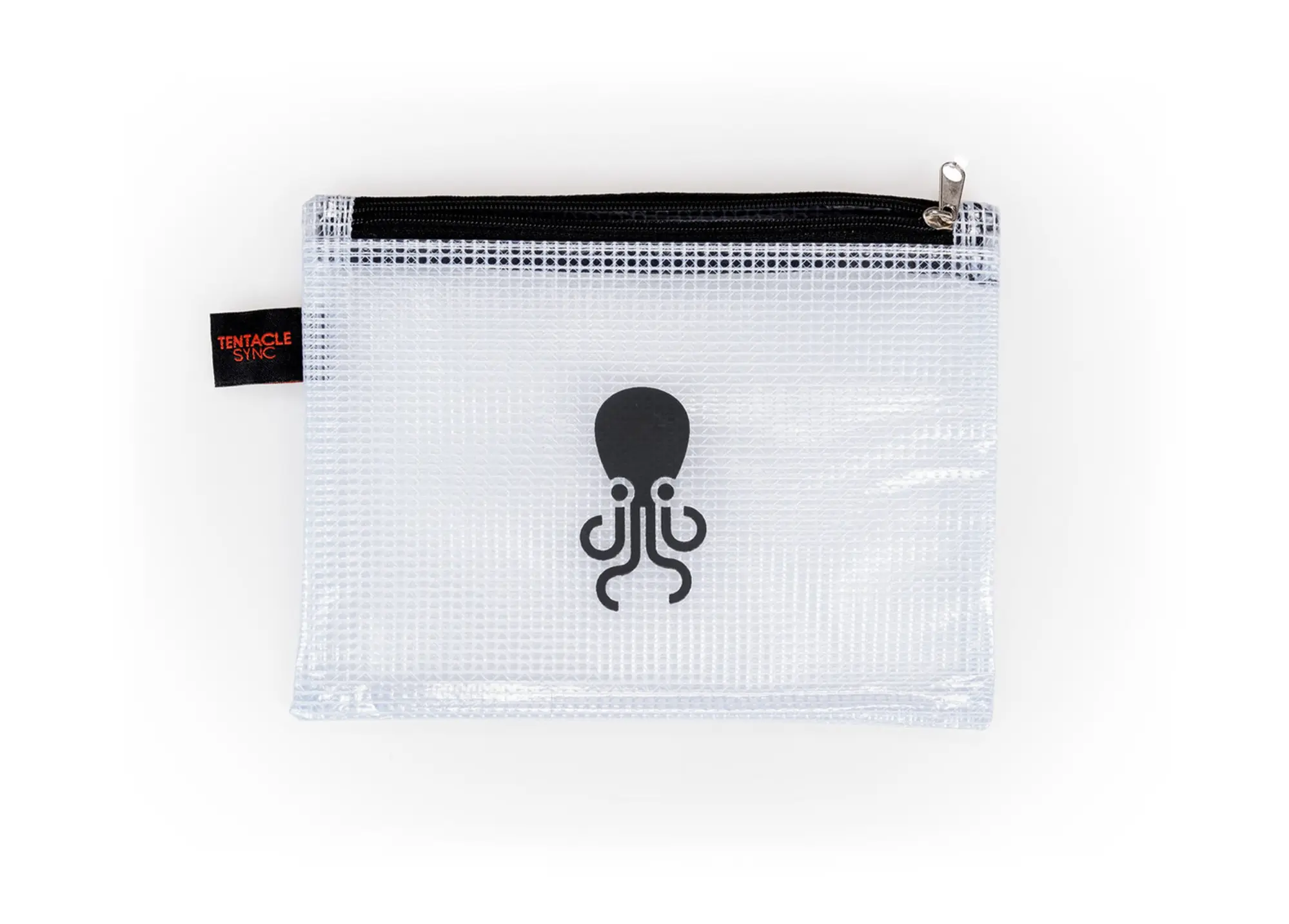 Bolsa Tentacle negra (19 x 13 cm) en malla transparente con dos bolsillos y cierres metálicos. Ideal para cables y accesorios Tentacle. También disponible en tamaño más grande rojo (A03).