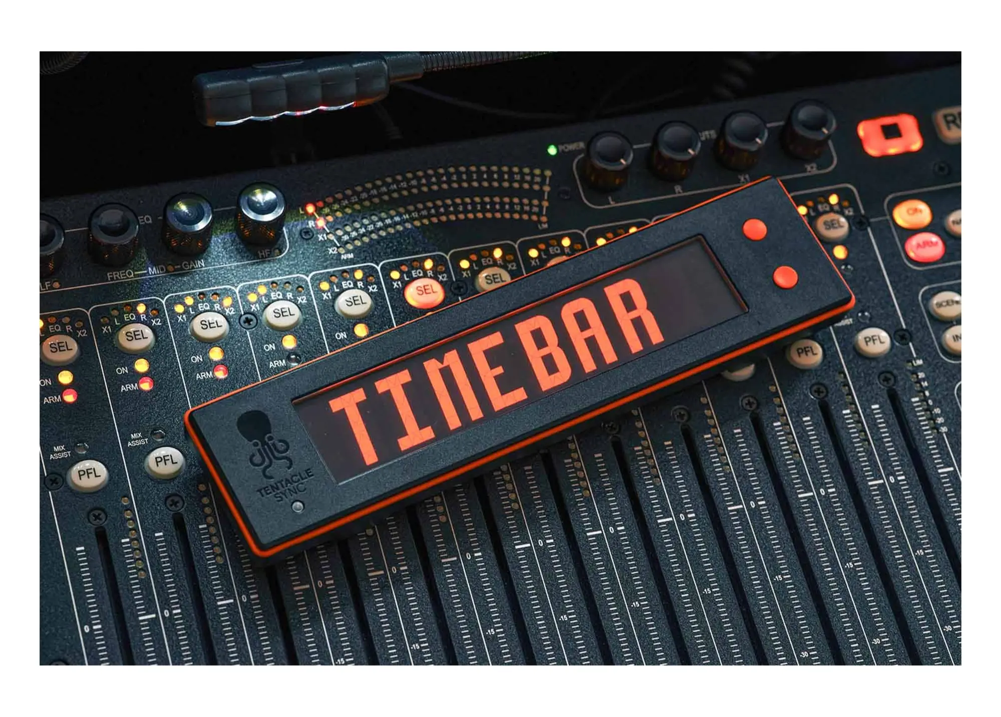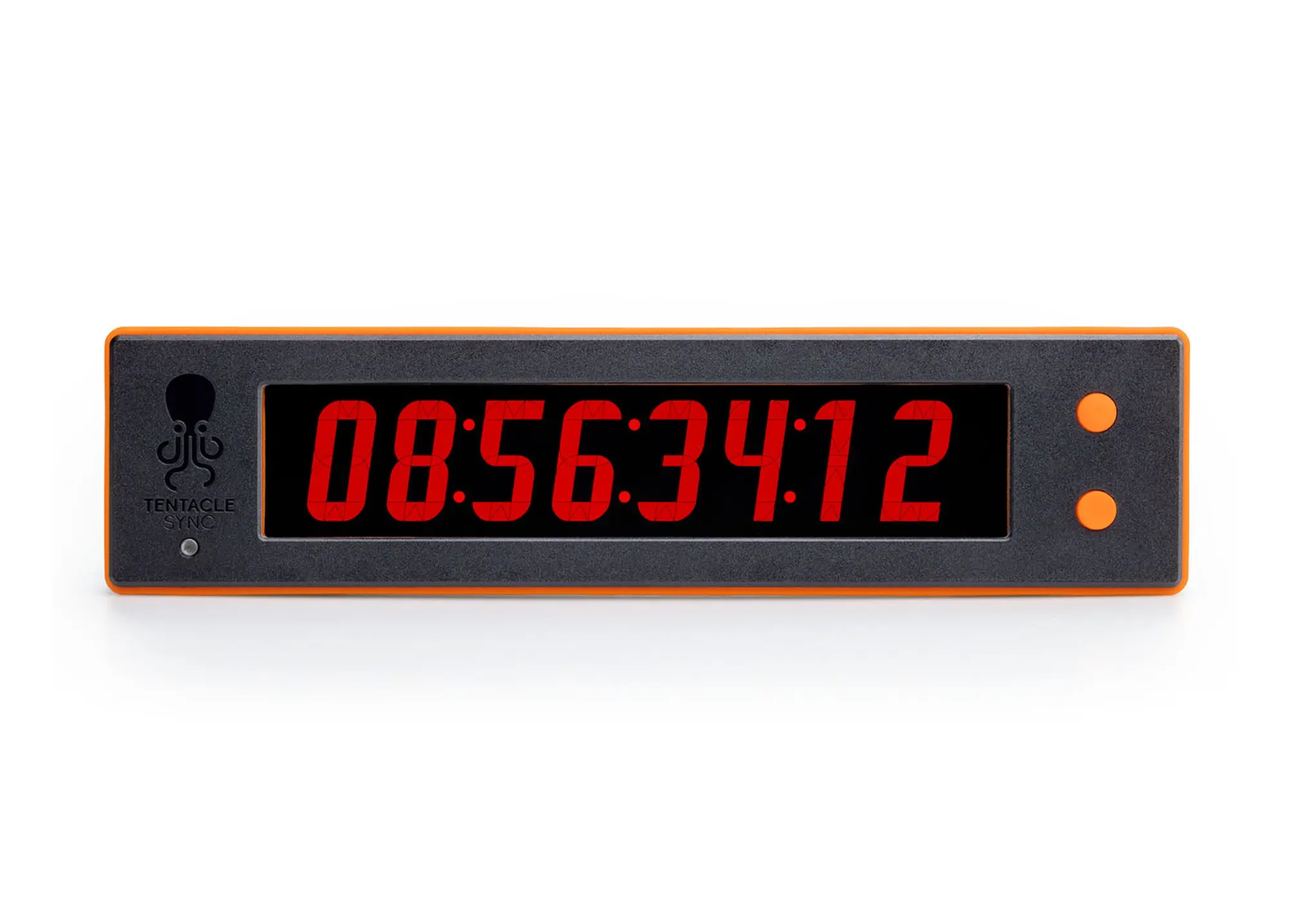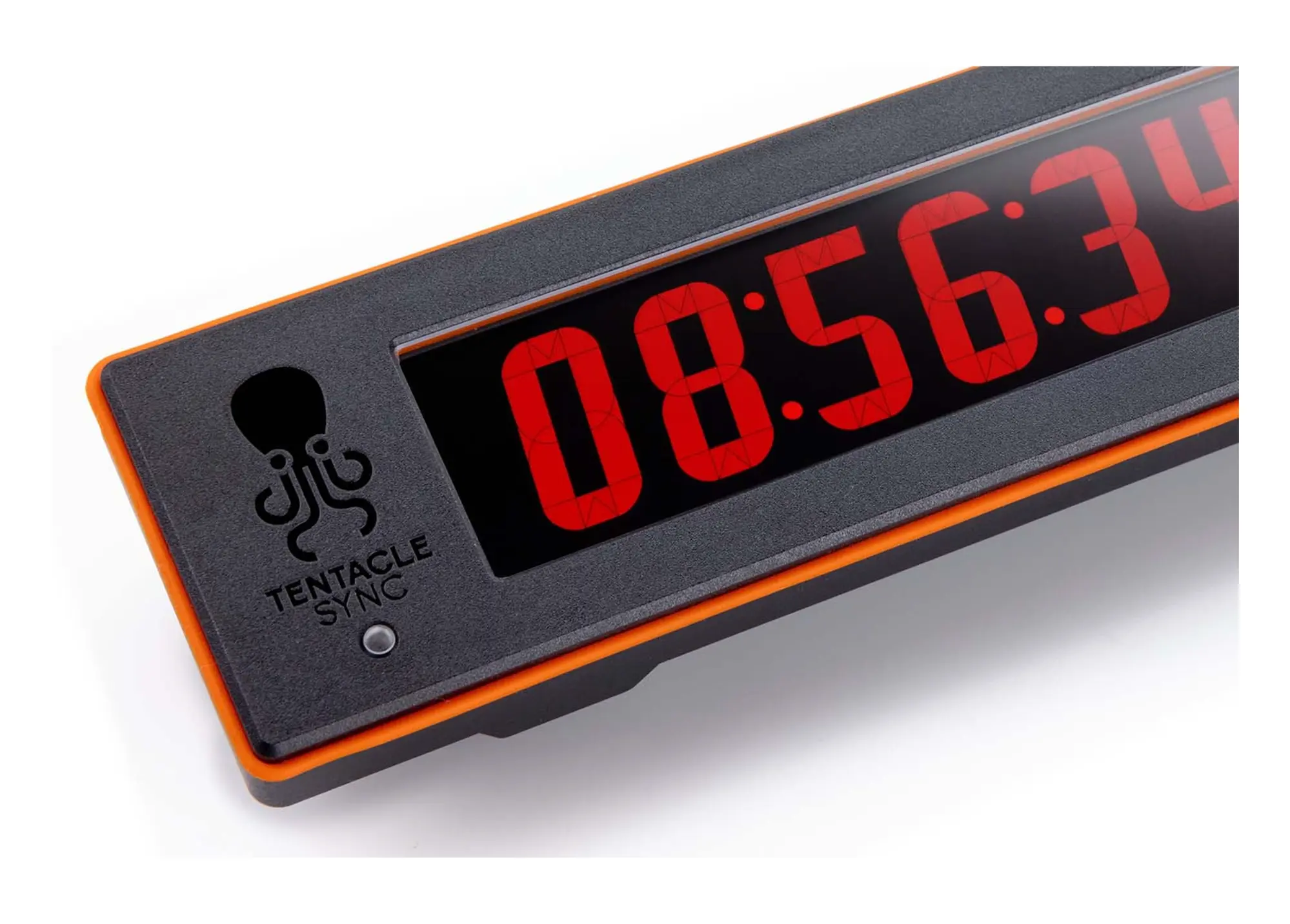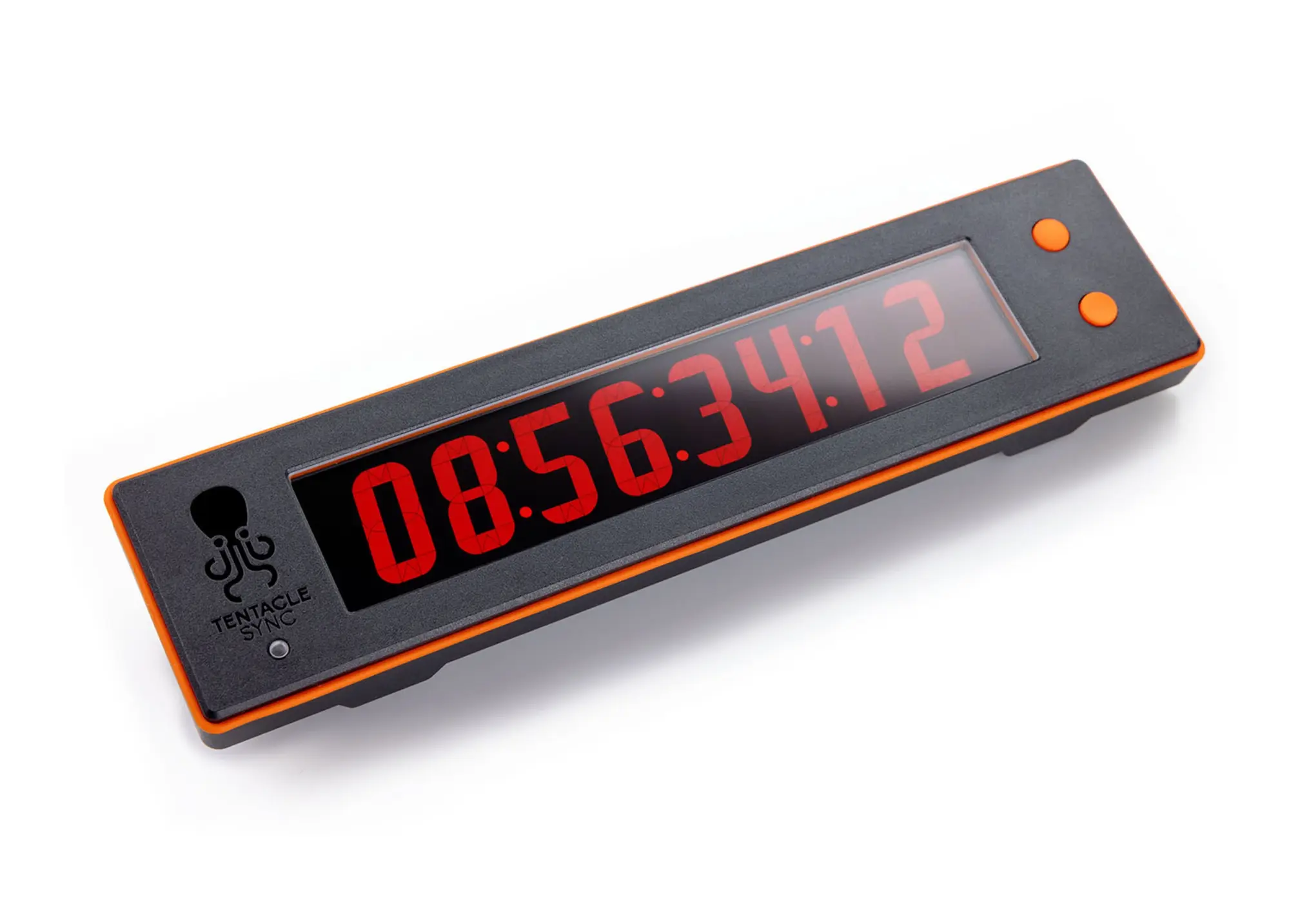 El Tentacle TIMEBAR es un display multifunción diseñado para la visualización y sincronización de código de tiempo. Equipado con pantalla OLED de alta luminosidad, es compatible con el ecosistema Tentacle Sync (SYNC E, TRACK E, TIMEBAR Slate) y con otros sistemas profesionales LTC como Ambient o Denecke.