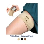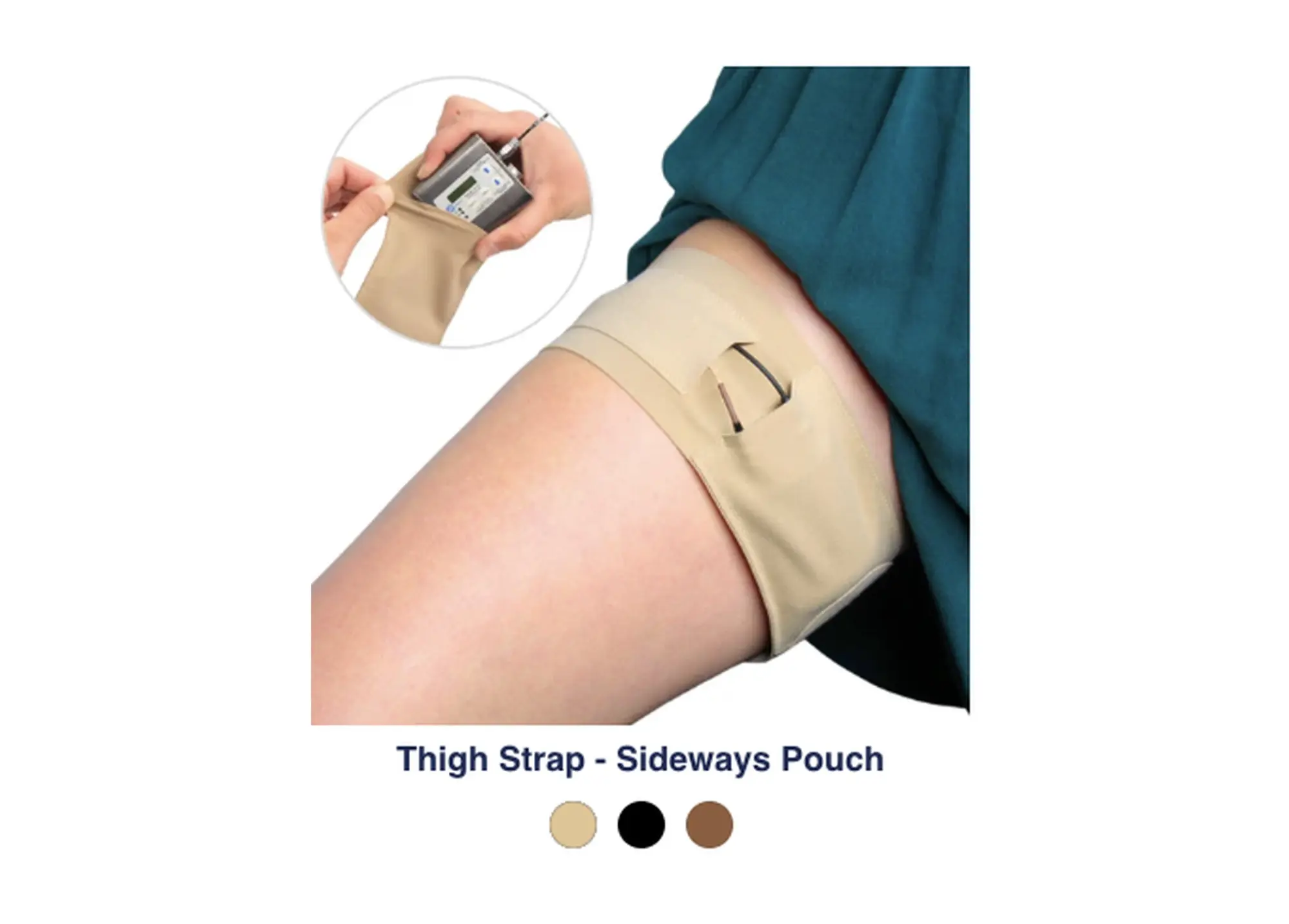La correa de muslo URSA con bolsa lateral cuenta con una bolsa horizontal para ocultar pequeños transmisores bajo prendas ajustadas, como minifaldas, e incluye un bolsillo para la antena y una banda de agarre hipoalergénica en el interior de la correa para evitar que se deslice por la pierna.