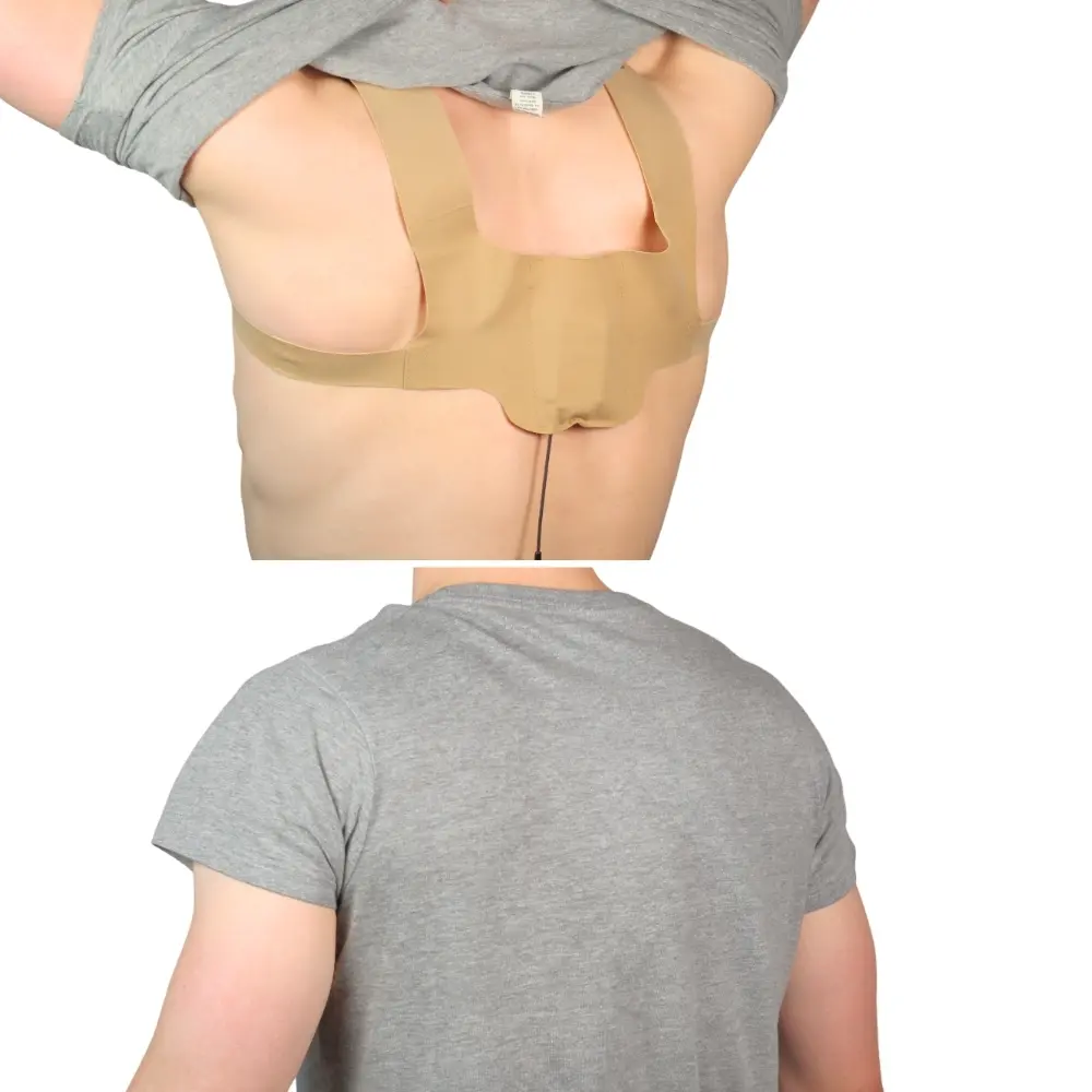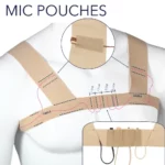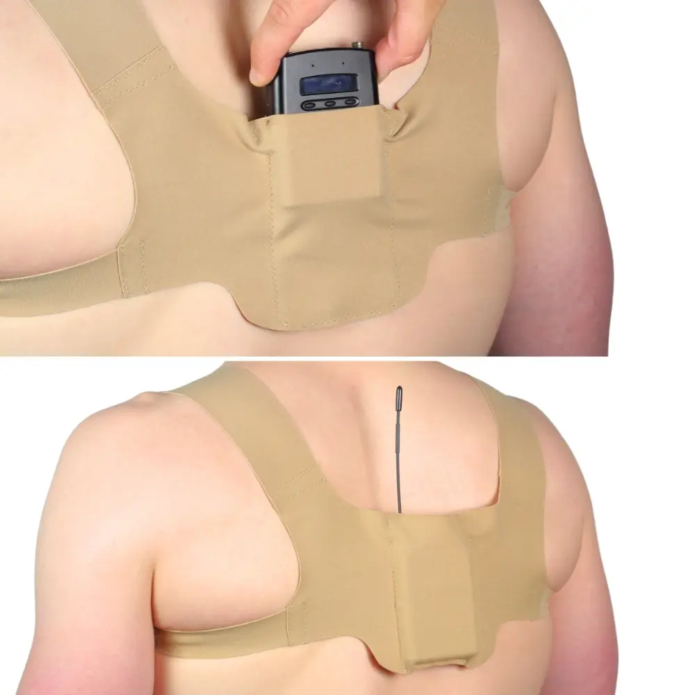 -Banda elástica profesional en configuración en “X” que distribuye uniformemente el peso del transmisor o equipo sobre torso y espalda, de perfil bajo para ocultación discreta bajo vestuario y con bolsillo integrado para transmisor sin necesidad de clips externos