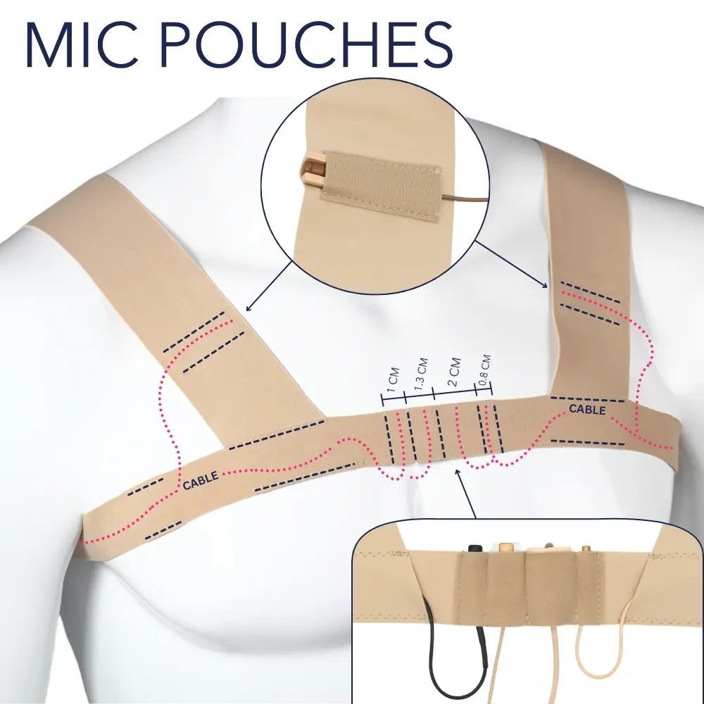 El interior de la correa tiene varias fundas para cables que mantienen el cable en su lugar, garantizando que los micrófonos estén siempre bien sujetos y que los cables nunca estorben.